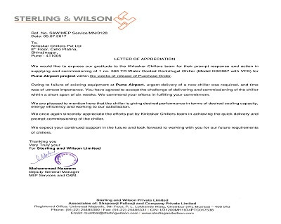 Letter of Appreciation from Sterling Wilson for Pune Airport
